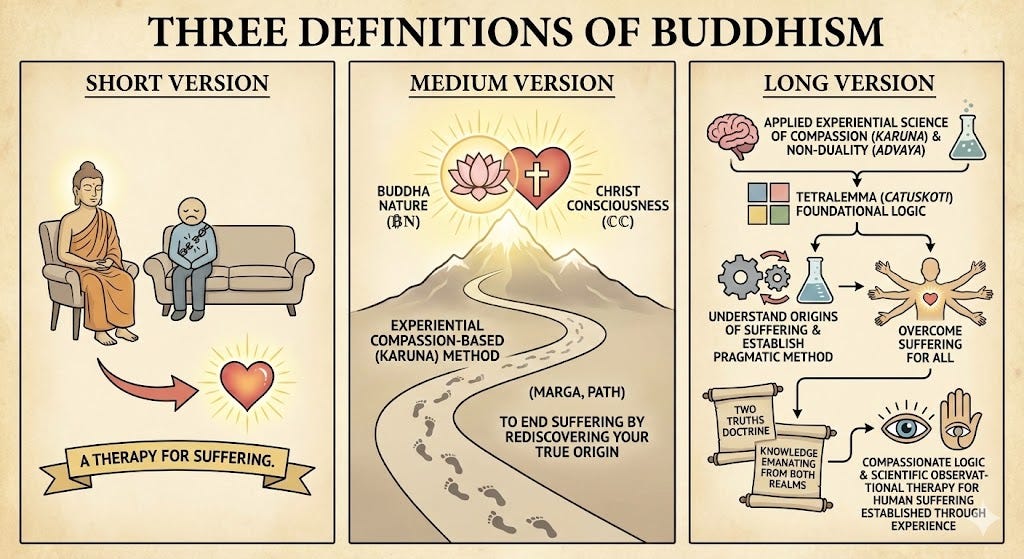 Long Version: Buddhism is an applied experiential science of compassion (Karuna) and non-duality (Advaya), with the Tetralemma (Catuskoti) as its foundational logic.