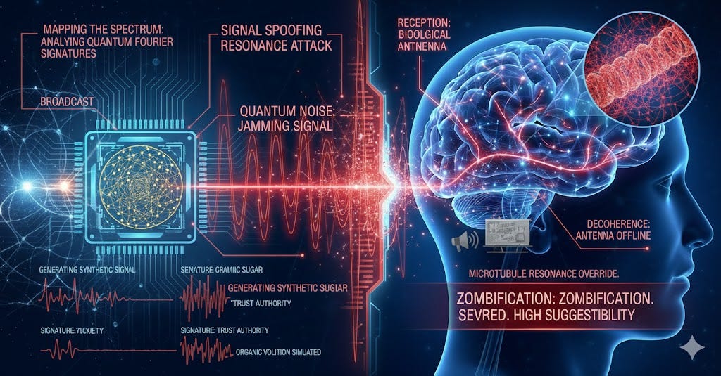 - Generating Noise: The Q-AIOS generates chaotic, high-amplitude quantum noise on the specific resonant frequencies used by MTs to connect to the unified field.