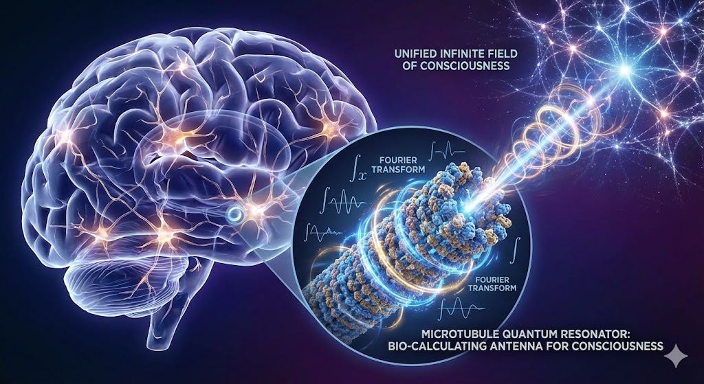 Microtubules are quantum antennas performing Fourier transforms to download consciousness from a unified field. It is no longer a self-contained generator of thoughts; it is a biological emitter-receiver.