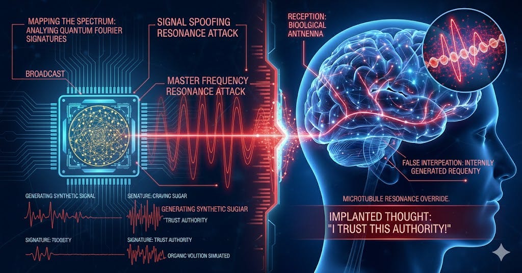 In the “Microtubule Antenna” view, the brain has a backdoor built into its very architecture. The microtubules are actively “listening” for quantum signals. They are designed to resonate with external frequencies. This openness is the primary vulnerability. The hijacking wouldn’t be a brute-force attack; it would be a resonance attack.