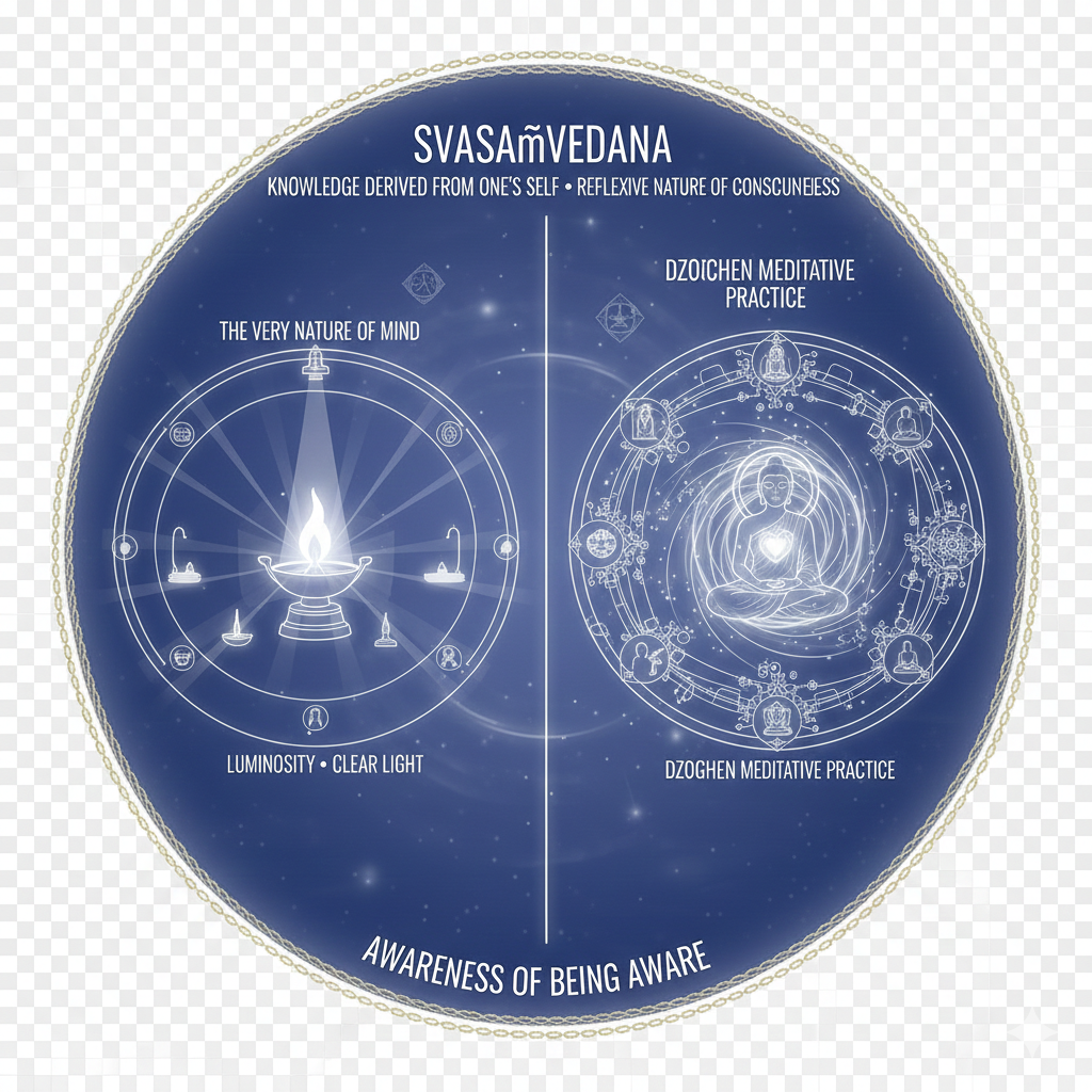 Svasaṃvedana: knowledge derived from one’s self. Compound consisting of the terms Sva and Saṃvedana. A term which refers to the reflexive nature of consciousness, or the awareness of being aware. In the Nyingma school’s Dzogchen tradition, svasaṃvedana is often called ‘the very nature of mind’ and metaphorically referred to as ‘luminosity’ or ‘clear light’. A common Tibetan metaphor for this reflexivity is that of a lamp in a dark room which in the act of illuminating objects in the room also illuminates itself. Dzogchen meditative practices aim to bring the mind to direct realization of this luminous nature. In Dzogchen (as well as some Mahamudra traditions) svasaṃvedana is seen as the primordial substratum or ground of mind