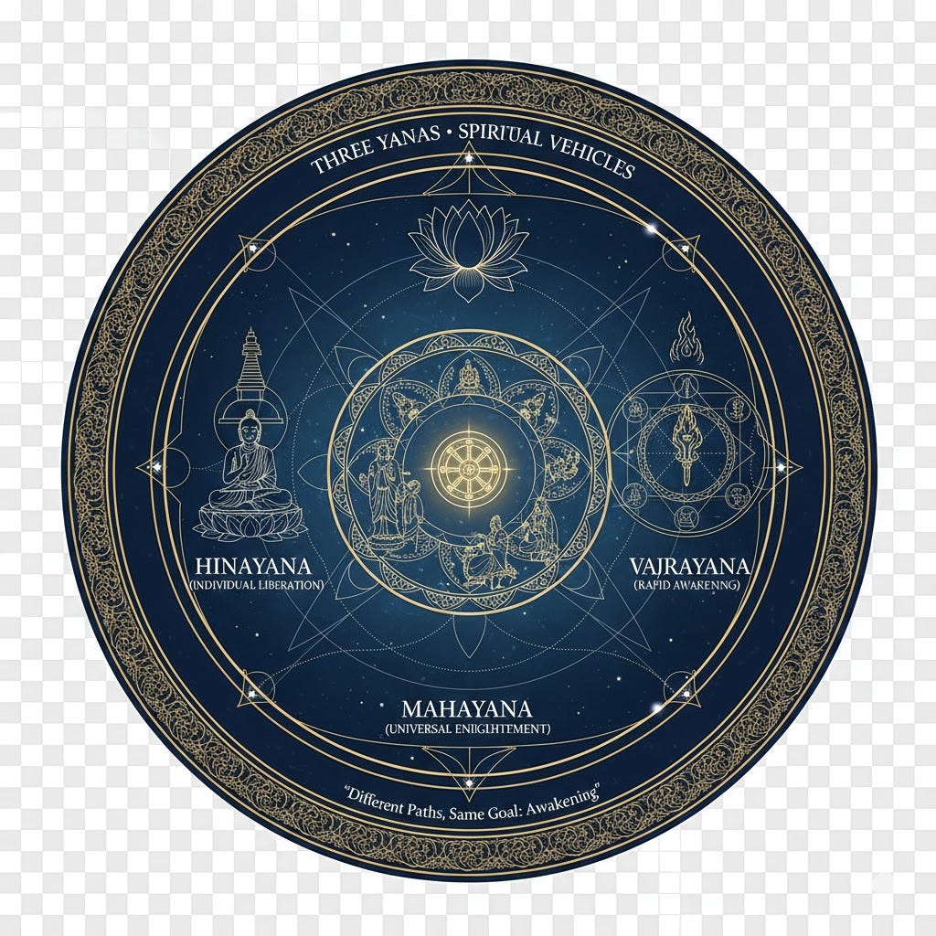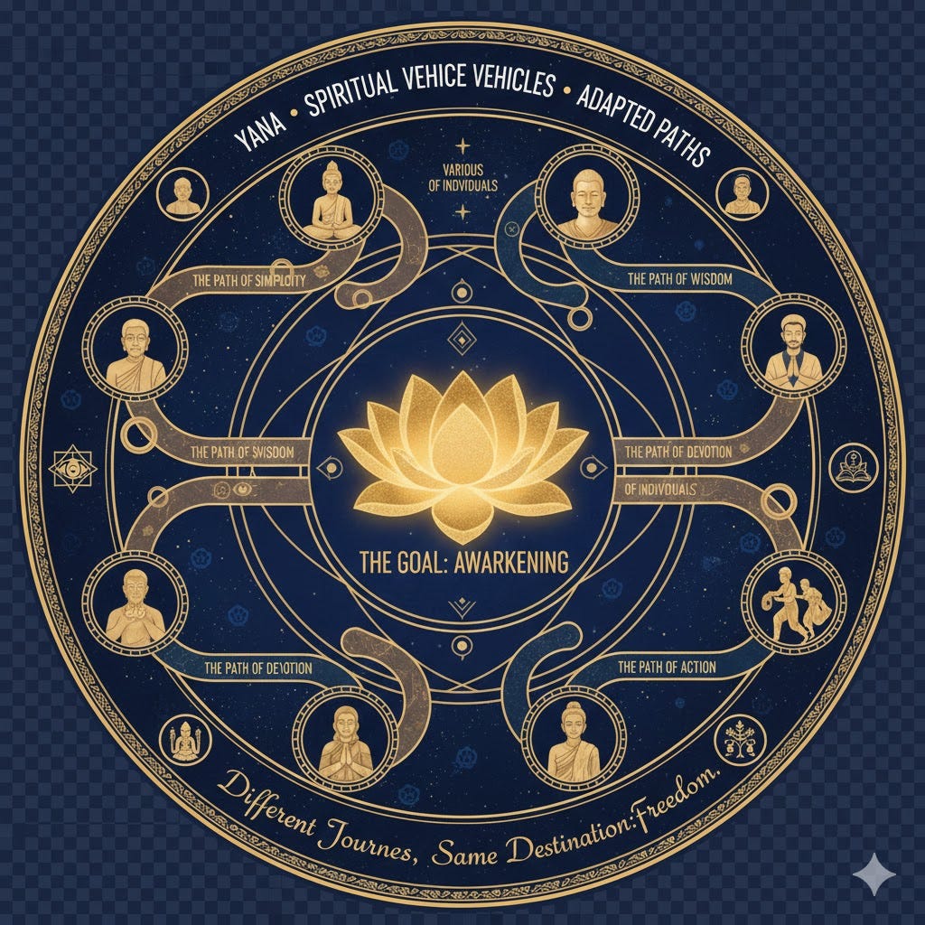 Yana: vehicle, refers to a mode or method of spiritual practice in Buddhism, taught in response to the various capacities of individuals. On an outwardly conventional level, the teachings and practices may appear contradictory, but ultimately they all have the same goal.