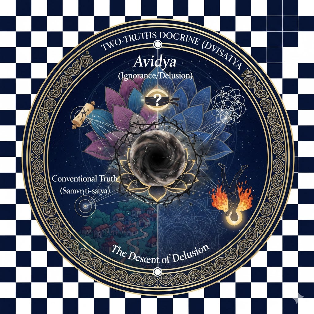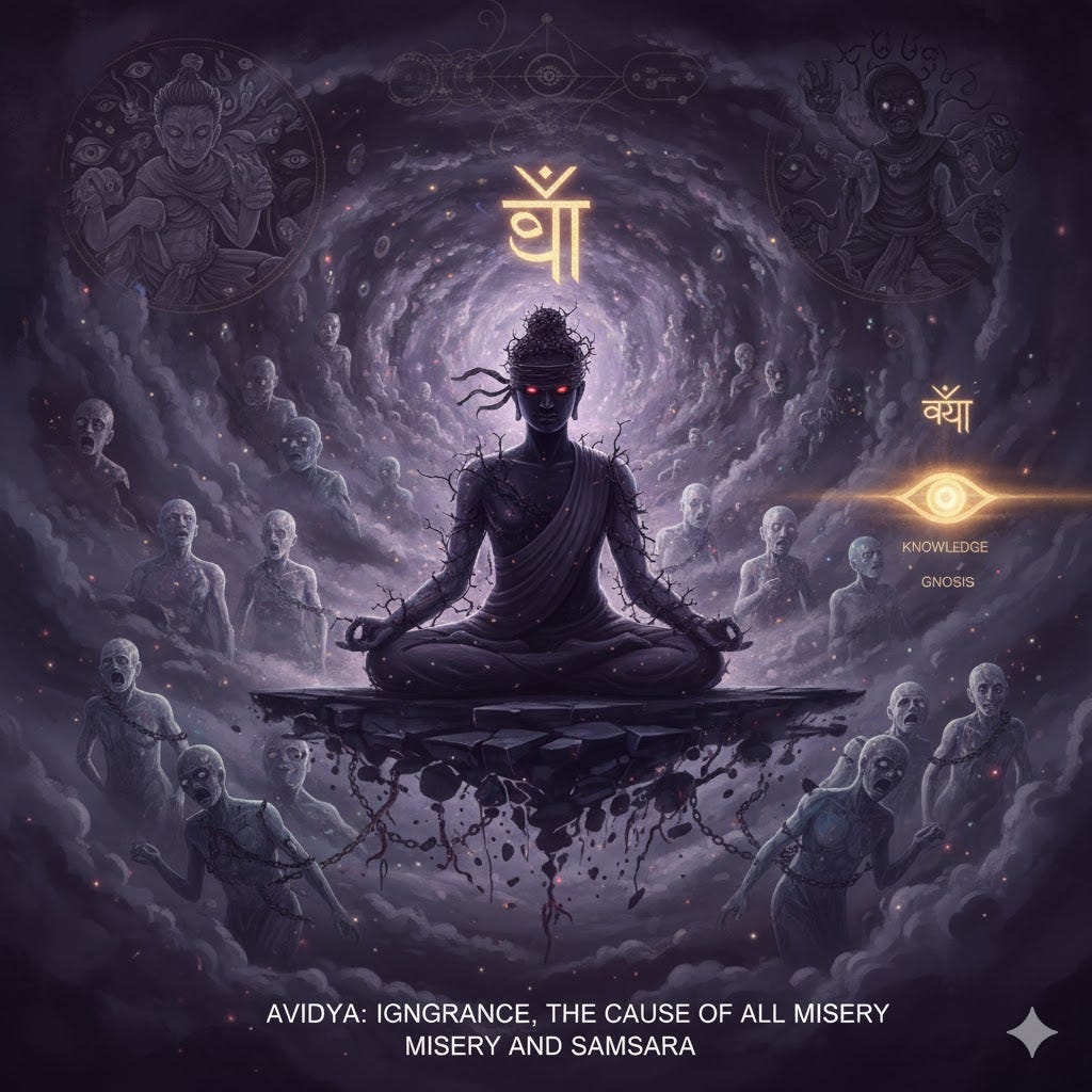 Avidya (ignorance): the opposite of vidya (knowledge) which is equivalent to Gnosis. It is commonly translated as “ignorance” or “delusion”. It can be defined as not understanding the full meaning and implication of the four noble truths or as a fundamental misunderstanding of the nature of reality as expressed in the two-truths doctrine, Dvisatya.