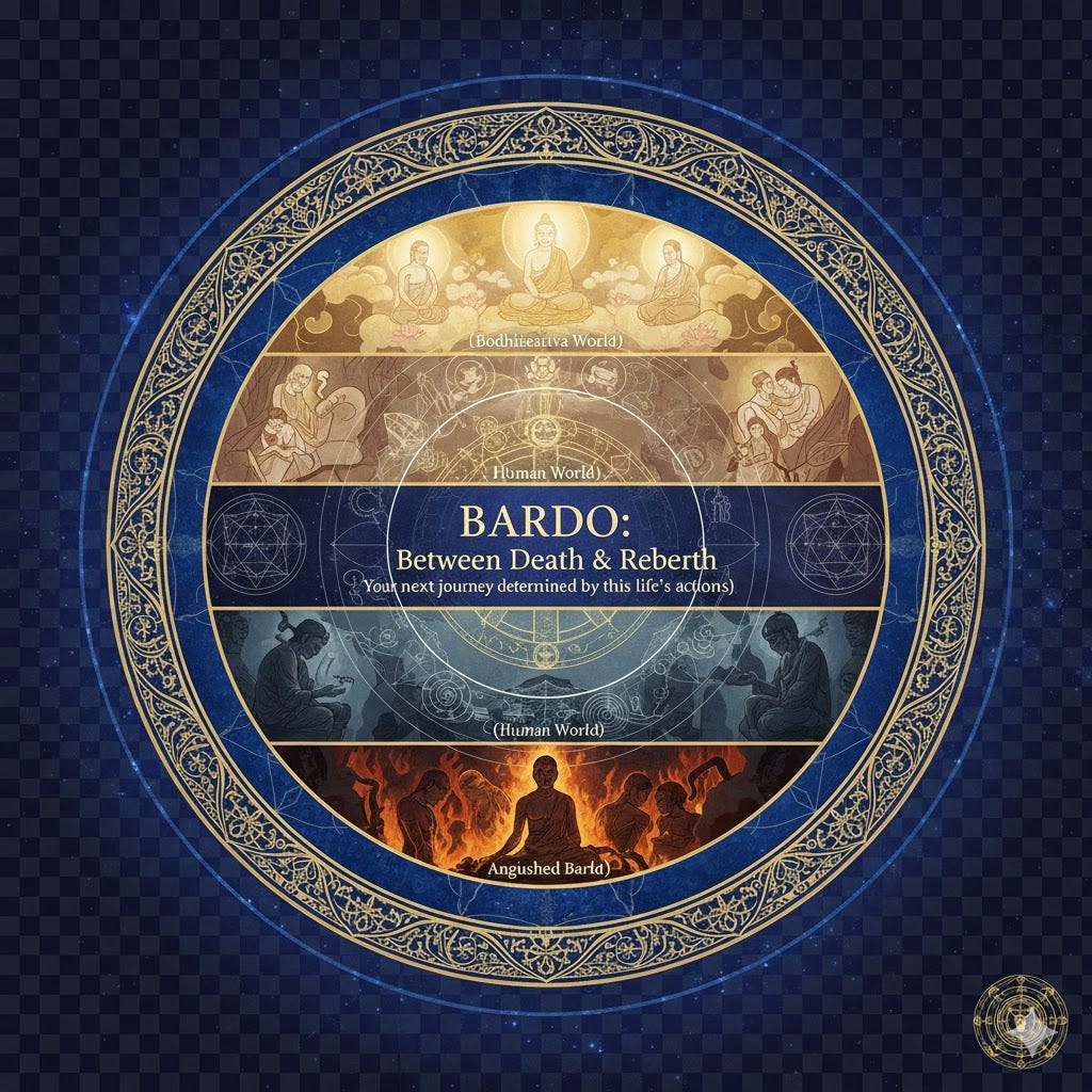 Bardo: an intermediate, transitional, or liminal state between death and rebirth. What you experience depends on the life condition you died in, for example, those in the world of hell will suffer anguish, and those in the world of Bodhisattva will experience bliss.
