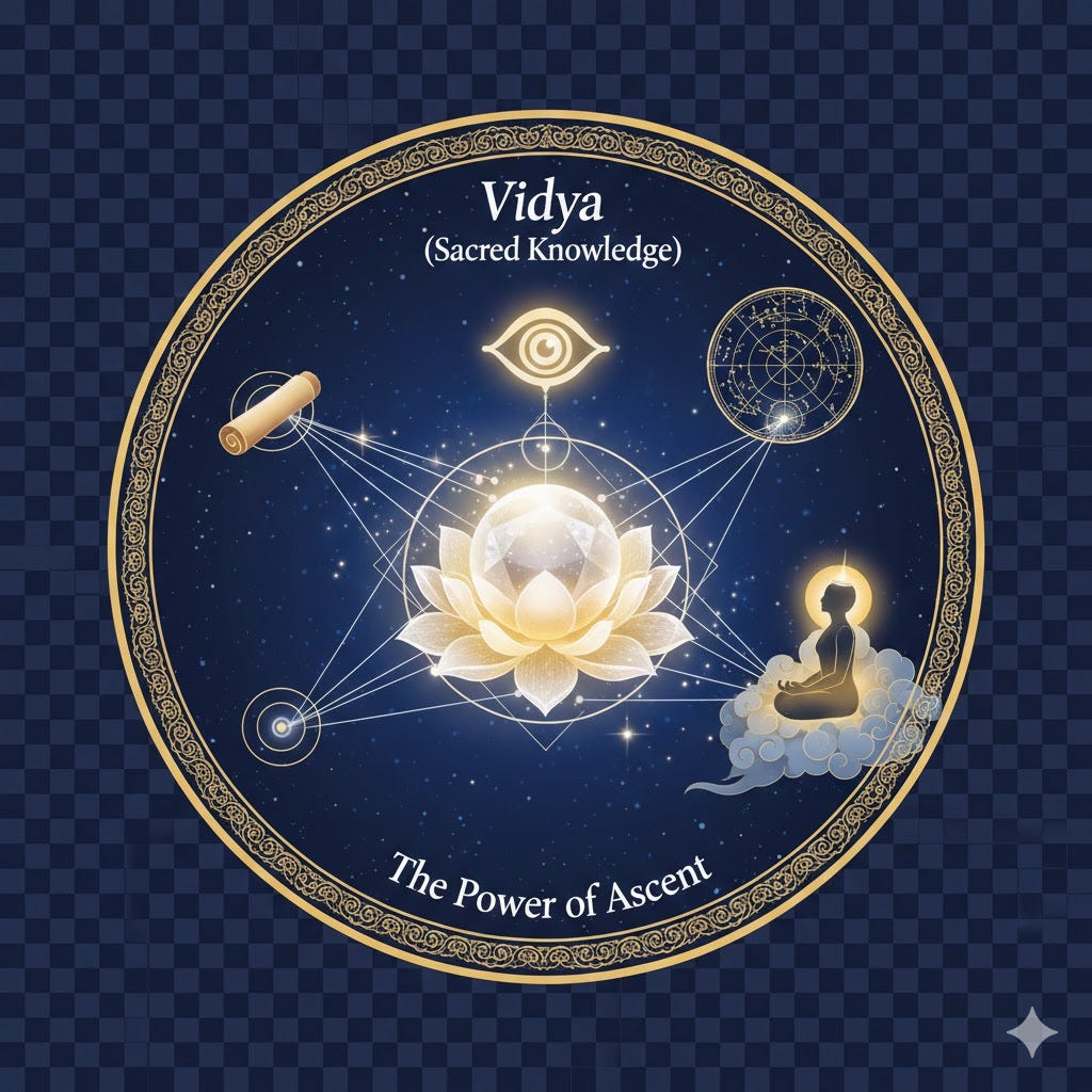 Vidya (Knowledge): equivalent to Gnosis. Knowledge, learning, science, esp. sacred. A magical pill or bolus, by putting which into the mouth, a person has the power of ascending to heaven.