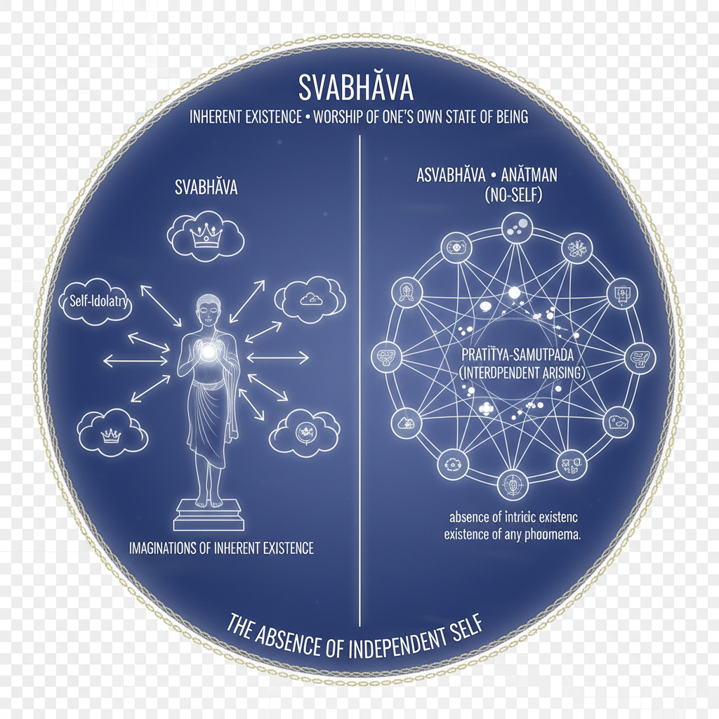 Svabhava: (imaginations of) inherent existence, worship of one’s own state of being. The opposite of Asvabhava, the absence of instrinsic existence of any phenomena, behind the concept of Anatman (no-self), as a direct consequence of Pratitya-Samutpada, interdependent arising.