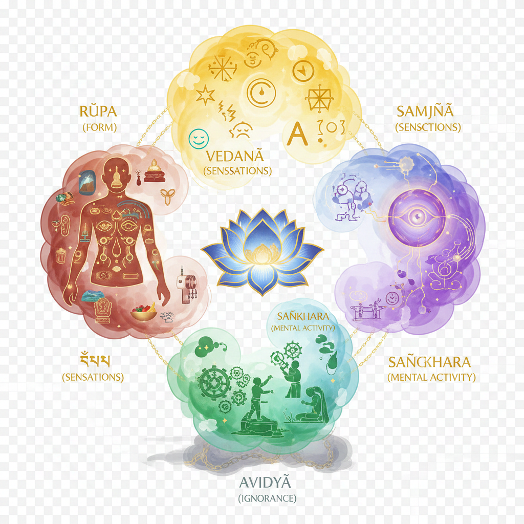 Skandha: the five aggregates of clinging, the five material and mental factors that take part in the perpetual process of craving, clinging and aversion due to avidya (ignorance). The five aggregates or heaps of clinging are: