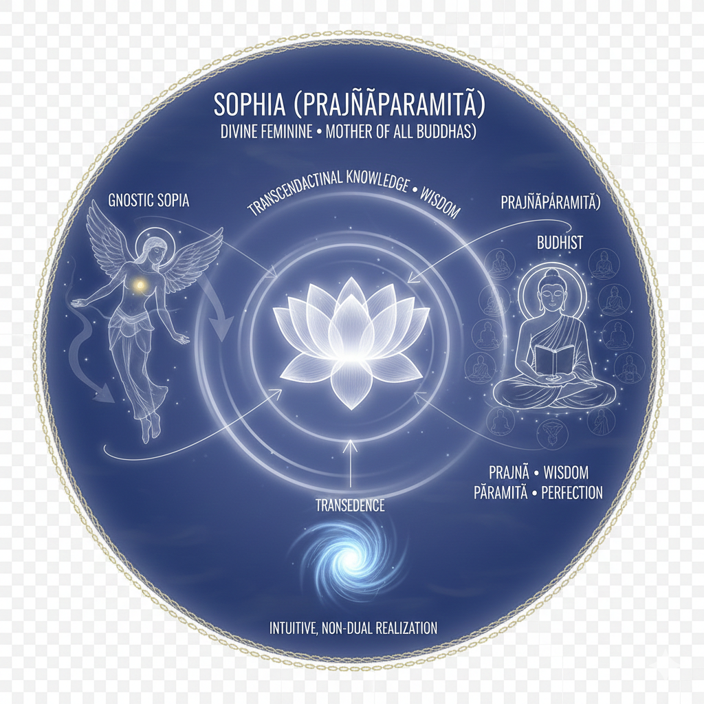 Prajnaparamita: Transcendental Knowledge, Wisdom. In Mahayana Buddhism, Prajnaparamita is the “Mother of all Buddhas.” The word Prajnaparamita combines the Sanskrit words prajna “wisdom” (or “knowledge”) with paramita, “excellence,” “perfection,” “noble character quality,” or “that which has gone beyond,” “gone to the other side,” “transcending. In Gnosticism, Sophia, the Divine Feminine, is the fallen-then-redeemed spark of divinity. Both represent the intuitive, non-dual realization that allows a human being to transcend the cycle of birth and death.