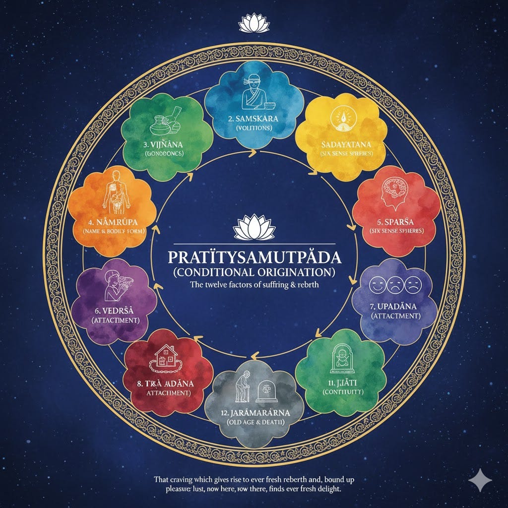 Twelve factors of conditional origination (Pratityasamutpada): 1. avidya (ignorance), 2. samskara (volitions), 3. vijnana (consciousness), 4. namarupa (name and bodily-form), 5. sadayatana (the six sense spheres), 6. sparsa (contact), 7. vedana (feeling), 8. trsna (craving), 9. upadana (attachment), 10. bhava (continuity), 11. jati (birth), 12. jaramarana (old age and death).