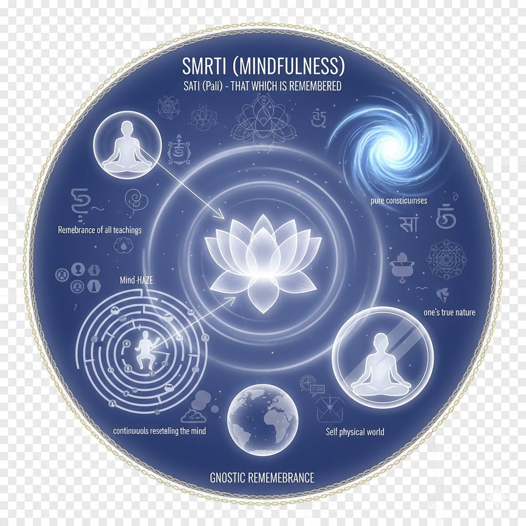 Smrti: Sati in PaliSati in Pali, the Sanskrit word smṛti literally means “that which is remembered” and refers to “mindfulness” in Buddhism. Through mindfulness one accomplishes ‘continuously resettling’ and ‘fully settling the mind’; whenever one is distracted one gathers the mind and slowly, through habituation, non-distraction occurs. It has a deep relationship with Gnostic Remembrance: The concept of Smrti in Buddhism is the essential technique of mindfulness, together with remembrance. Not just remembrance of all the teachings, but remembrance of one’s true nature of pure consciousness in an act of self-reflection and separation through the self-experimentation of an avatar in the physical world.
