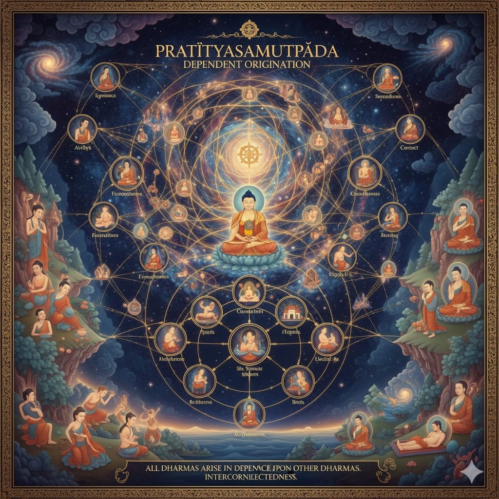 Pratityasamutpada: the doctrine of pratityasamutpada, often translated as “dependent arising,” is an important part of Buddhist phenomenology and, some argue, metaphysics. Common to all schools of Buddhism, it states that phenomena arise together in a mutually interdependent web of cause and effect. It is variously rendered into English as “dependent origination”, “conditioned genesis”, “dependent co arising”, “interdependent arising”, or “contingency”. It is a key doctrine in Buddhism shared by all schools of Buddhism. It states that all dharmas (phenomena) arise in dependence upon other dharmas.