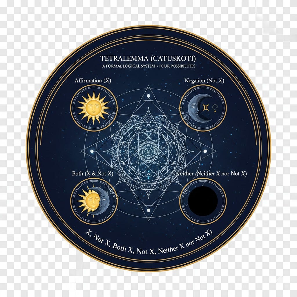 Tetralemma: A formal logical system different from binary logic, based on four propositions: with reference to any logical proposition (or axiom) X, there are four possibilities: X (affirmation), not X (negation), X and not X (both), neither X nor not X (neither).