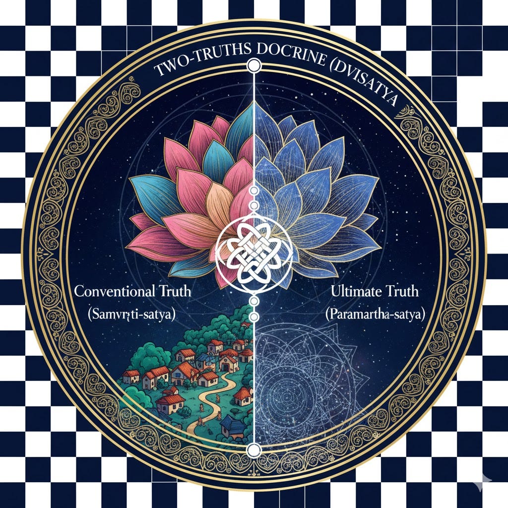 Two-Truths doctrine (dvisatya): In Buddhism, Two-truths refers to the philosophical distinction between relative (conventional) truth (Saṃvṛti-satya) and absolute (ultimate) truth (Paramartha-satya). This concept encompasses both how things appear in the world and their true nature, highlighting the duality of reality. The framework is essential for understanding existence, as it delineates between worldly phenomena and deeper, transcendental insights. This dual approach transcends sects like Tibetan, Mahayana, and Theravada Buddhism, each interpreting the Two truths in ways that articulate the nature of reality and suffering.
