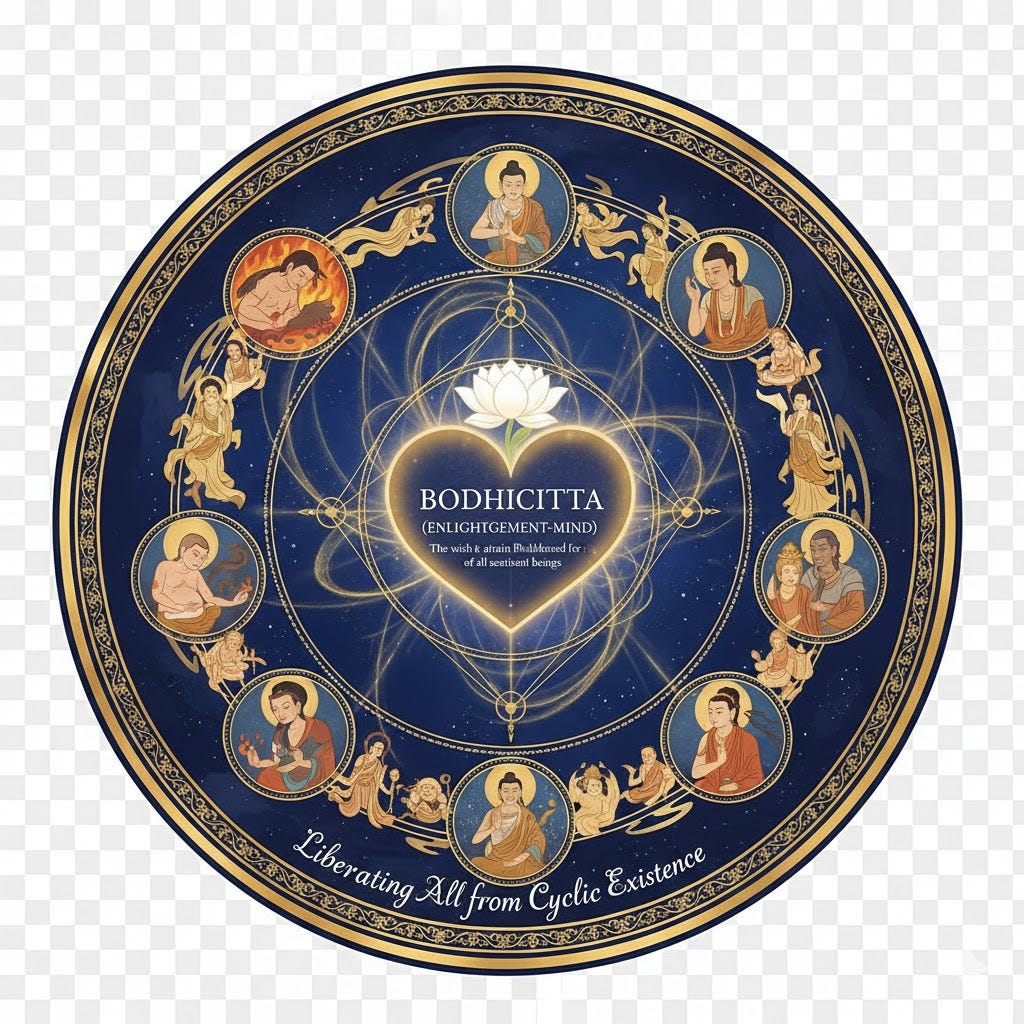 Bodhicitta: In Buddhism, bodhicitta is the wish to attain complete enlightenment (that is, Buddhahood) in order to be of benefit to all sentient beings — beings trapped in cyclic existence (Samsara) and have not yet reached Buddhahood. One who has bodhicitta as the primary motivation for all of his or her activities is called a Bodhisattva.
