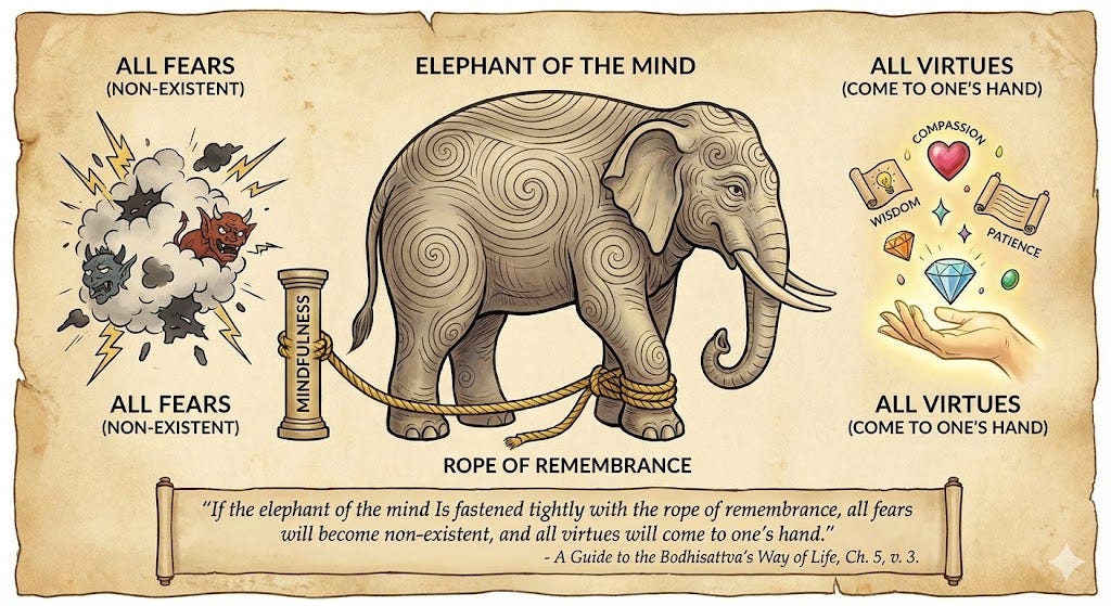 “If the elephant of the mind Is fastened tightly with the rope of remembrance, All fears will become non-existent And all virtues will come to one’s hand”, from A Guide to the Bodhisattva’s Way of Life, Ch. 5, Guiding Awareness, v. 3