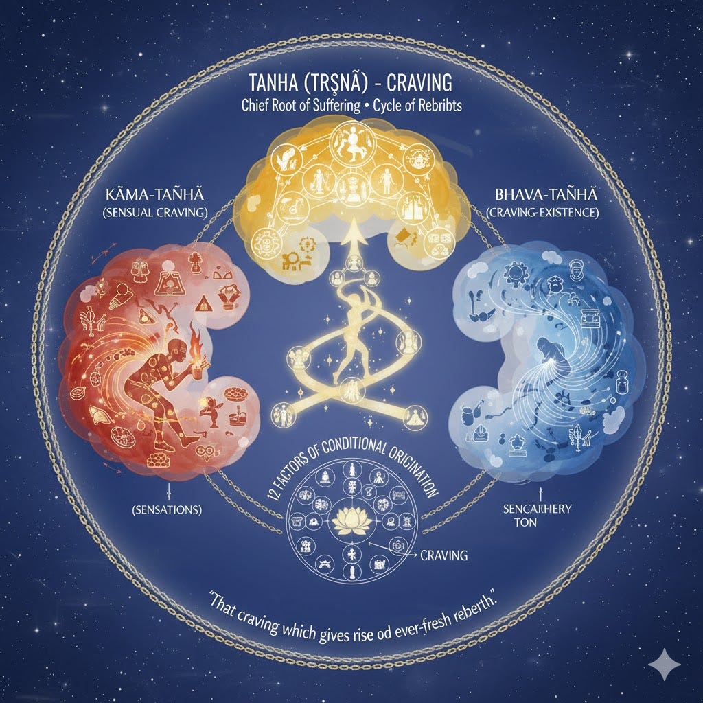 Tanha (trsna): craving, one of the 12 factors of conditional origination. Craving is the chief root of suffering, and of the ever-continuing cycle of rebirths. “What, o monks, is the origin of suffering? It is that craving which gives rise to ever-fresh rebirth and, bound up with pleasure and lust, now here, now there, finds ever fresh delight.”