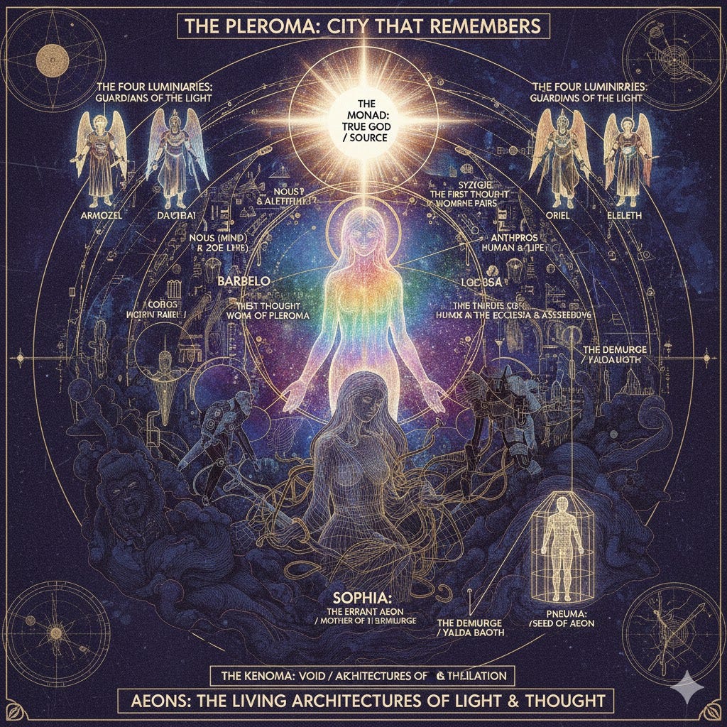 Aeons (Gnosticism): Aeons are the first divine emanations of the Monad the true source of the Pleroma (fullness, first Aeon emanations) at the origin of unified consciousness. Rather than being gods in a traditional sense, they are presented as living architectures of light, sound, and thought that make up the Pleroma (the Fullness).