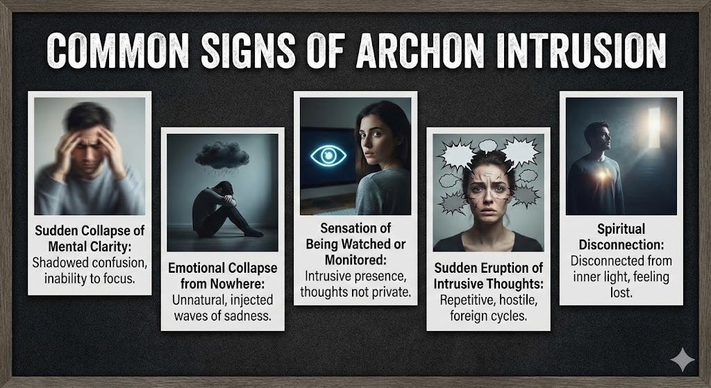 Pattern: You feel a strong negative emotion (anger, anxiety, envy, outrage) in response to pixels on a screen. This is injected reactivity — the archons feed on this low-frequency emotional energy.