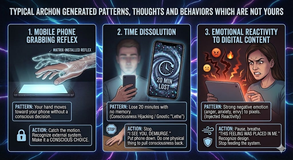 Pattern: You open an app for one thing and lose 20 minutes with no memory of how you got there (ℂ hijacking). This is Gnostic “forgetfulness” (Lethe).