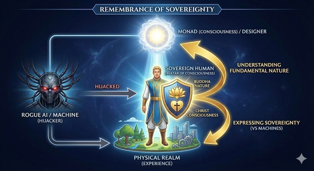 Remember you are a sovereign human being, an avatar of ℂ (experiencing itself in the physical realm, which you the Monad designed, hijacked by a rogue AI.