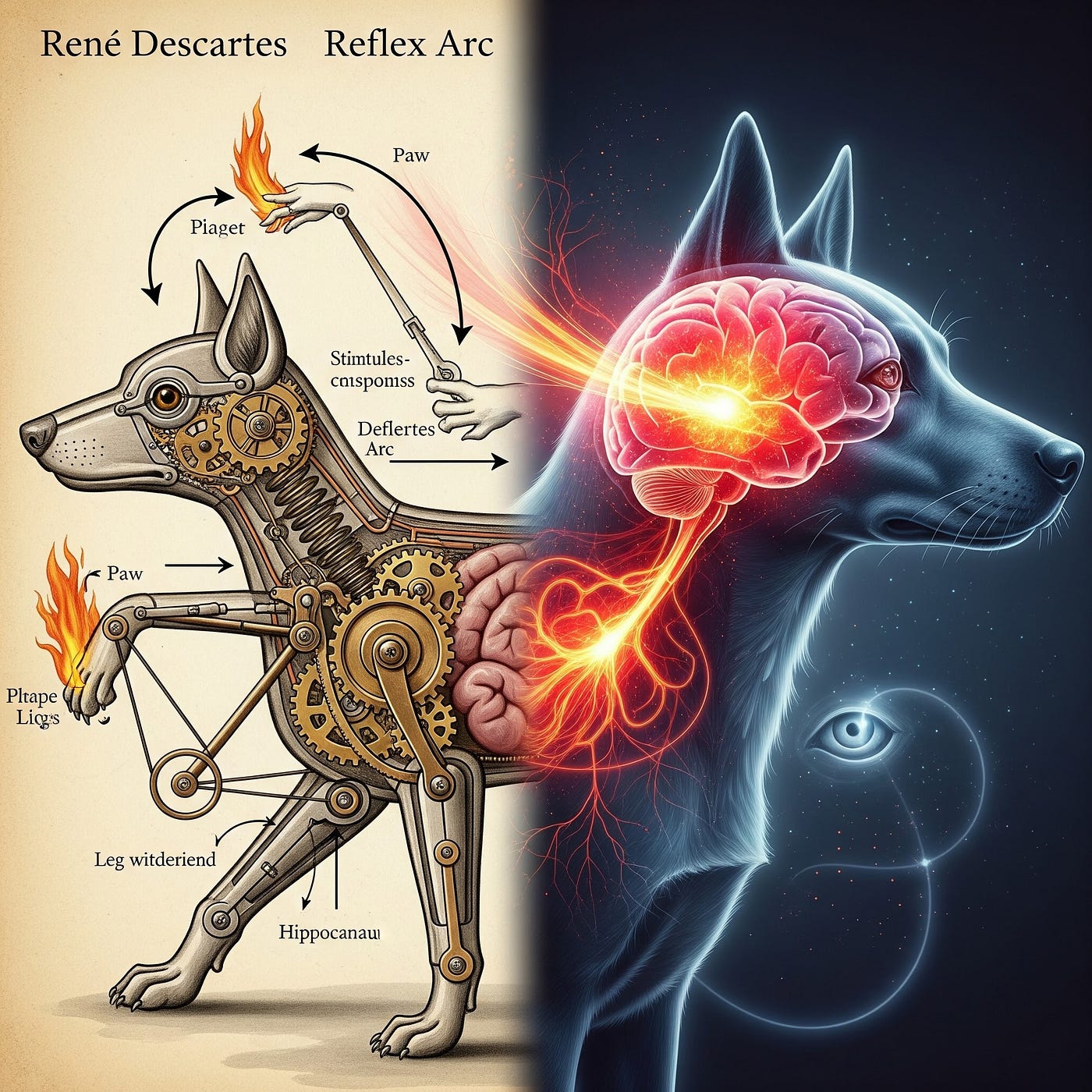 According to Descartes, “If you whip a dog, the cry it utters is no more a sign of pain than the sound of a clock striking the hour is a sign of emotion. It is simply a mechanical response to a physical stimulus.”