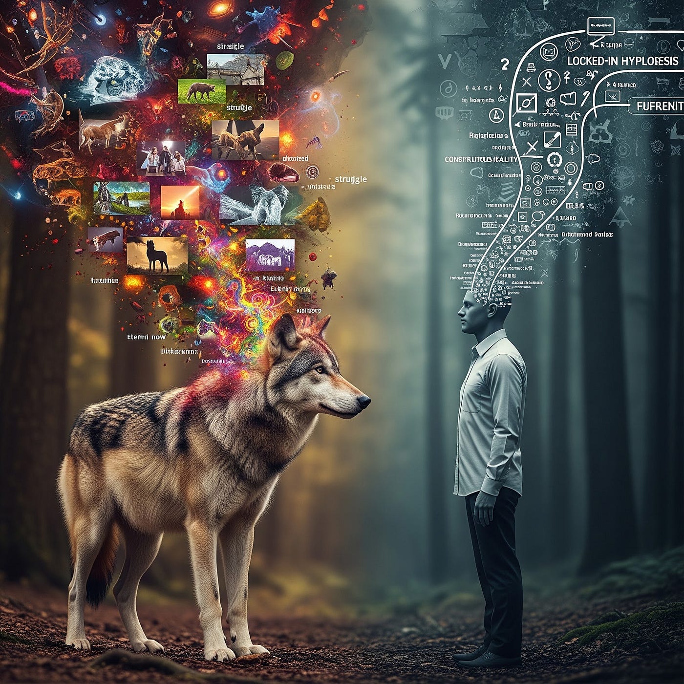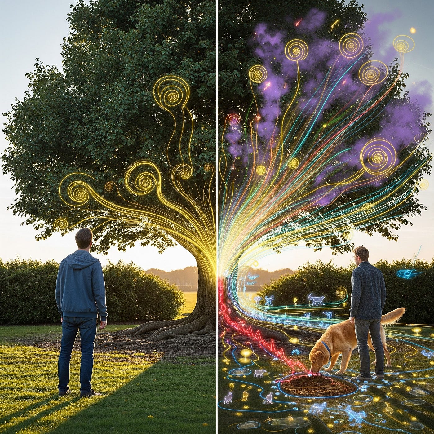 By reframing animal existence not as a lack, but as an intense and unfiltered experience — the raw emotion of the eternal present — we shatter the myth of our own superiority. Human intelligence then appears in a new light: a form of deliberately restricted perception, filtered by the neocortex for survival, while animals are endowed with a pure and amplified consciousness that makes them “hyper-souled” beings.