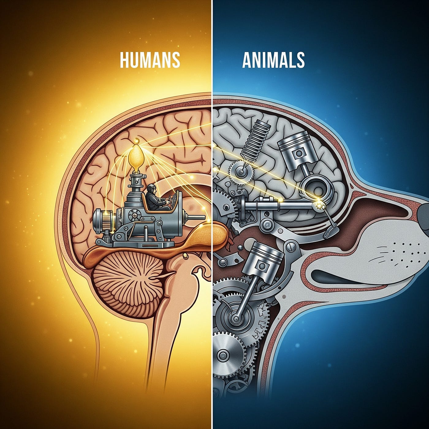 Descartes believed that in humans, the soul was located in the pineal gland, acting as a motor. In animals, the pineal gland existed, but it served only as a “valve” for animal spirits, with no “pilot” at the controls.