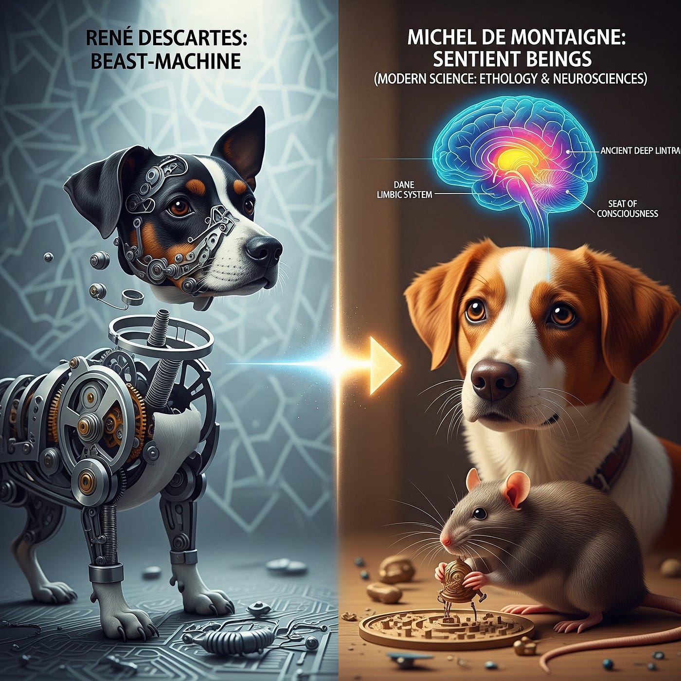 In response to this mechanistic view, we explores, on the one hand, early critiques, notably those of Michel de Montaigne in the 16th century, who argued for fundamental equality between humans and animals by denouncing “human presumption.” On the other hand, we examines the revolution in neuroscience and the Cambridge Declaration on Consciousness (2012), which definitively refute Cartesian dualism.